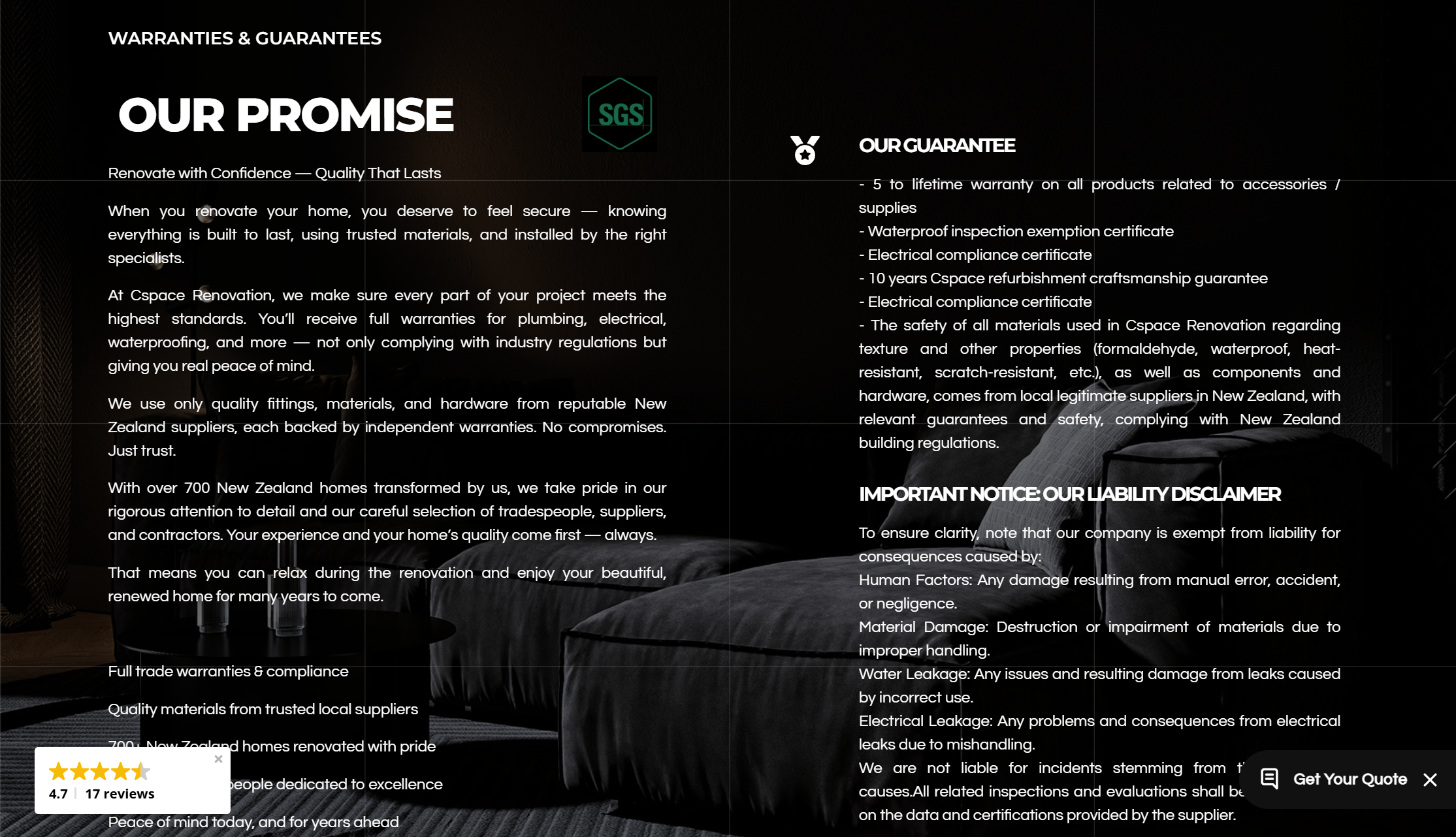 The Cspace Renovation website highlights the company’s key strengths: innovative design, exceptional craftsmanship, and highly competitive pricing. The professional team includes designers, project managers, carpenters, tilers, plumbers, electricians, painters, and cabinet installers — all supported by state-of-the-art German equipment to deliver superior workmanship. Cspace provides an end-to-end renovation service covering both interior spaces (kitchens, bathrooms, living rooms, etc.) and exterior upgrades (walls, roofs, decks, fences, etc.). The company offers a 15-year waterproofing guarantee, product warranties, and workmanship assurance, serving Auckland and major cities throughout New Zealand.