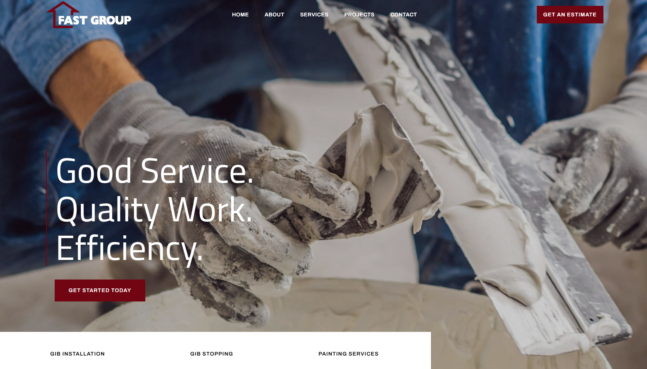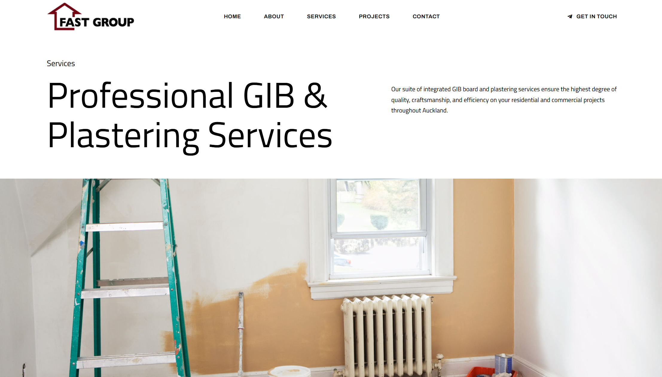 The Fast Group website showcases its core service philosophy: Good Service, Quality Work, and Efficiency. The company focuses on delivering high-quality finishing work on time and within budget, offering services such as GIB board installation, GIB board stopping, interior and exterior painting, and specialist plastering. The website design reflects the company's professionalism and its attention to detail and client satisfaction.